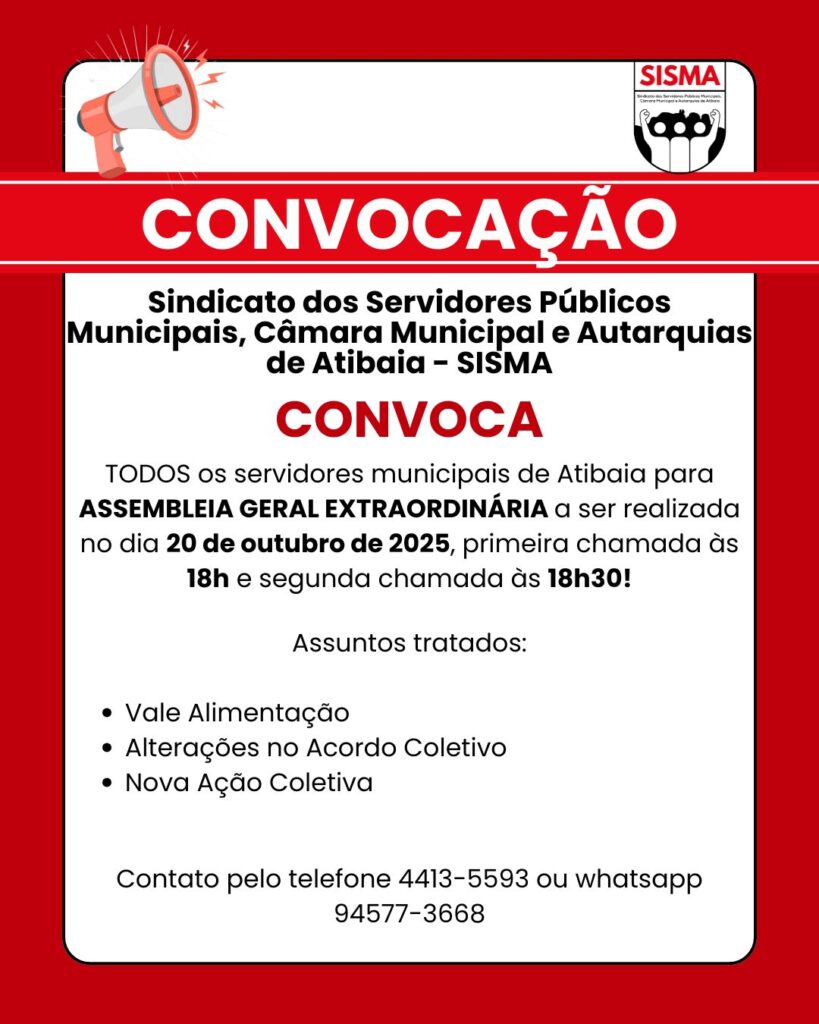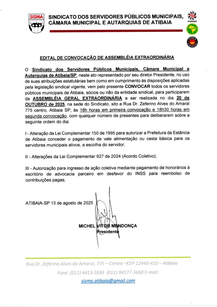 ASSEMBLEIA GERAL EXTRAORDINÁRIA NO DIA 20 DE OUTUBRO DE 2025!